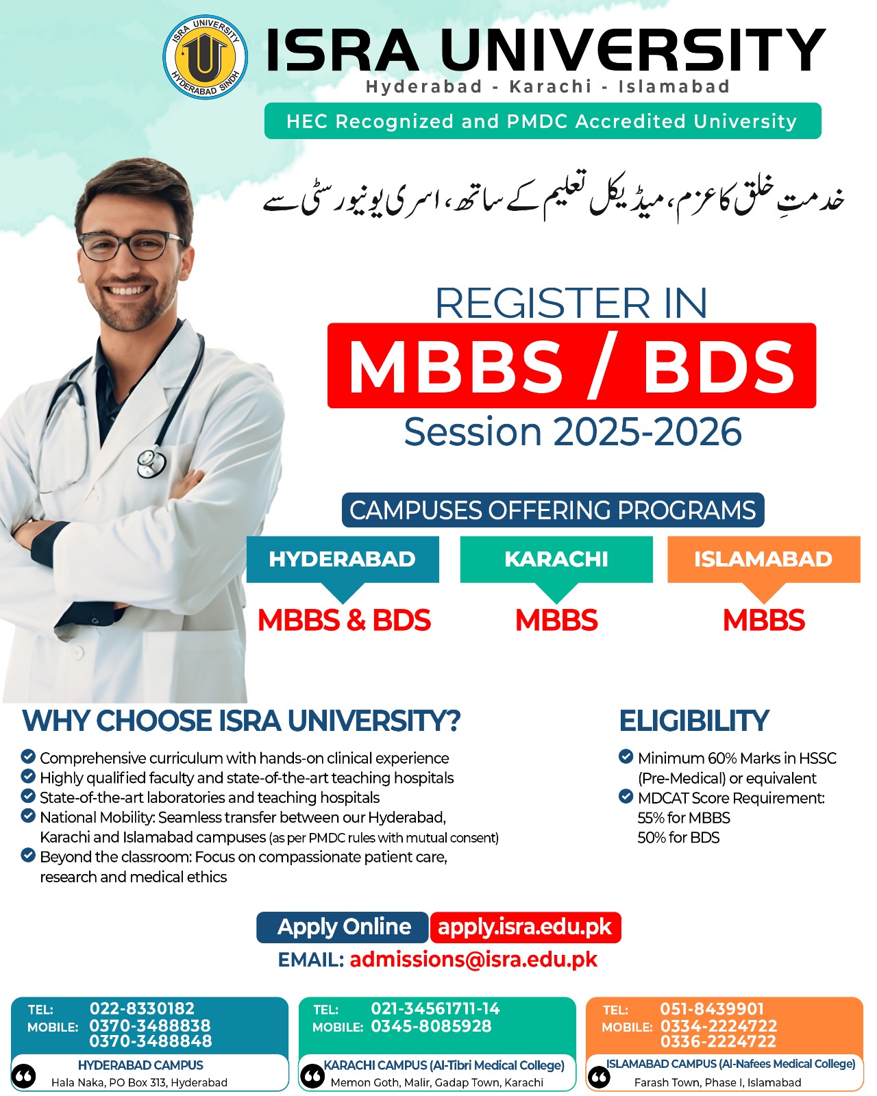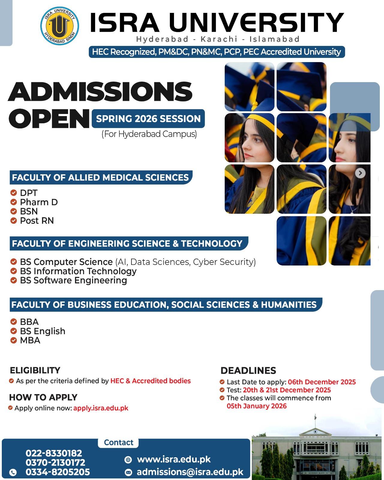Isra University is pleased to announce that admissions are now open for the Spring 2026 Session in our various undergraduate and graduate programs at the Hyderabad Campus. If you are interested in joining a vibrant academic community and pursuing a quality education in your chosen field, you can apply now.